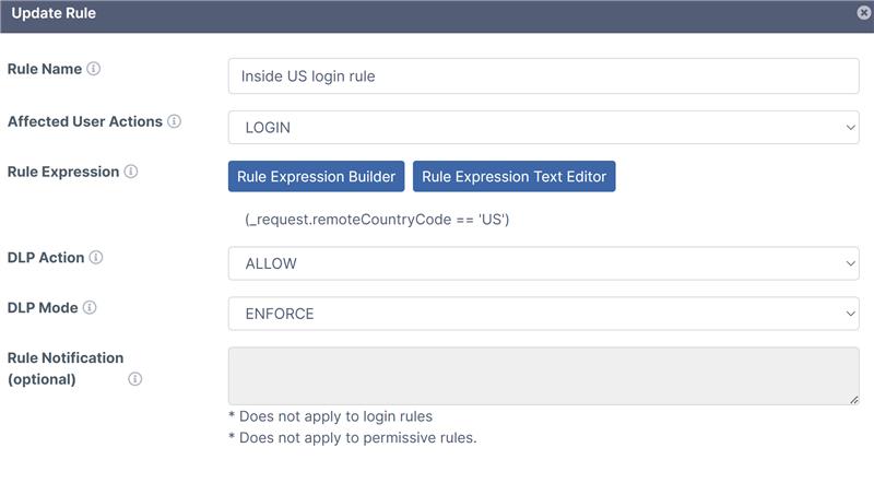 NOTE: The DLP setting in the screenshot above will only allow logins based on IP addresses that match the country code indicated. In the example above, it's US; everything else will be blocked. However, if GeoIP Chart is not set to TRUE, the country code for the IP returns Unknown and will block all login requests. See the article for reference.